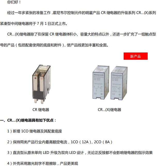 經(jīng)過一年多緊張的準(zhǔn)備工作,霍尼韋爾控制元件的明星產(chǎn)品CR繼電器的升級系列CR...(X)系列緊湊型中間繼電器將于7月1日正式上市。