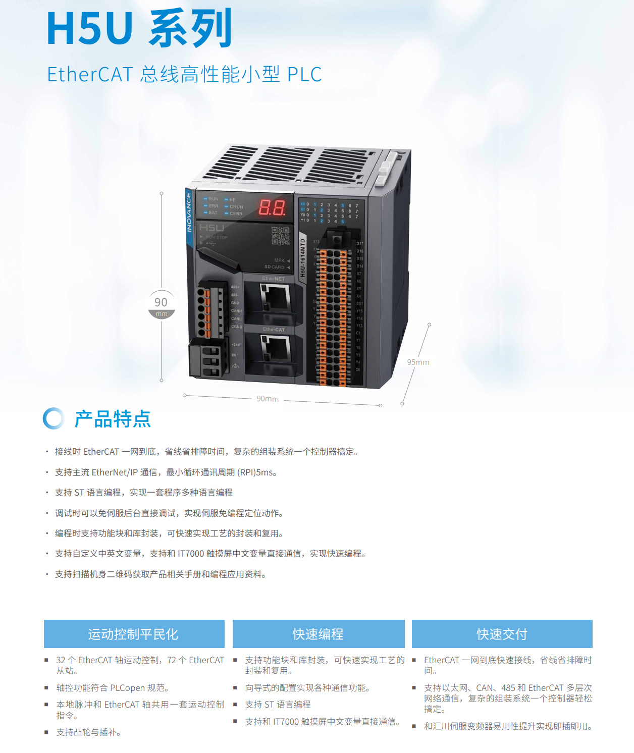 匯川技術推出首個應用EtherCAT 總線的小型PLC H5U,讓線體設備飛速運轉。隨著終端消費日趨升級,生產制造面臨巨大的壓力,而H5U 能夠簡化布線量、加快編程調試時間、滿足帶軸能力的要求以及嚴苛的成本控制需求,從容應對嚴峻的挑戰,是將EtherCAT總線應用到小型PLC 的先鋒之作。